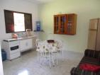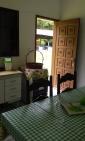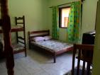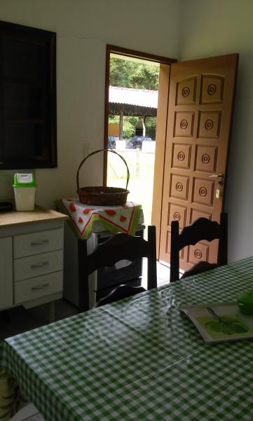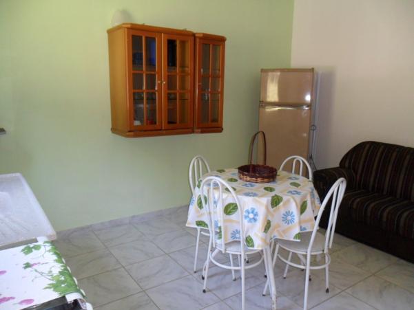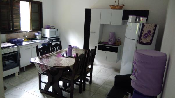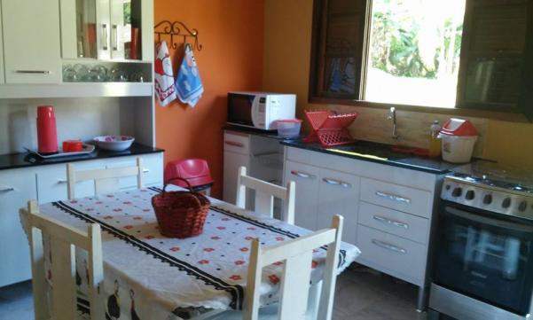 Quarto com cama de casal e dois beliches, cozinha completa com utensílios domésticos.
